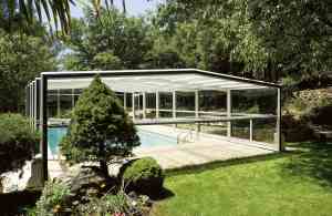 De forme quasi cubique ce type d'abri de piscine comporte 4 pans, soit 2 en parois verticales (parfois légèrement inclinées) et 2 formants toiture. Ces abris sont général très plats, ce qui malheureusement favorise l’accumulation de neige en hiver.