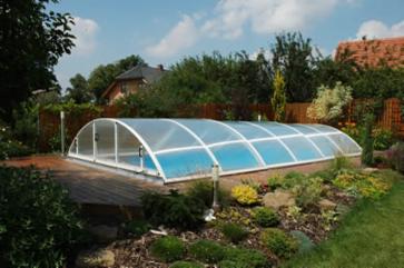 Cette sorte d'abri de piscine posséde à la fois des parois verticales droites sur les cotés et une toiture cintrée formant un dôme. On retrouve surtout ce type de forme sur les abris de piscine mi-hauts, en version telescopique.